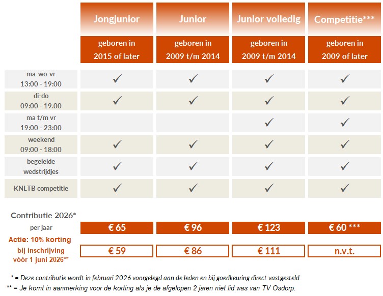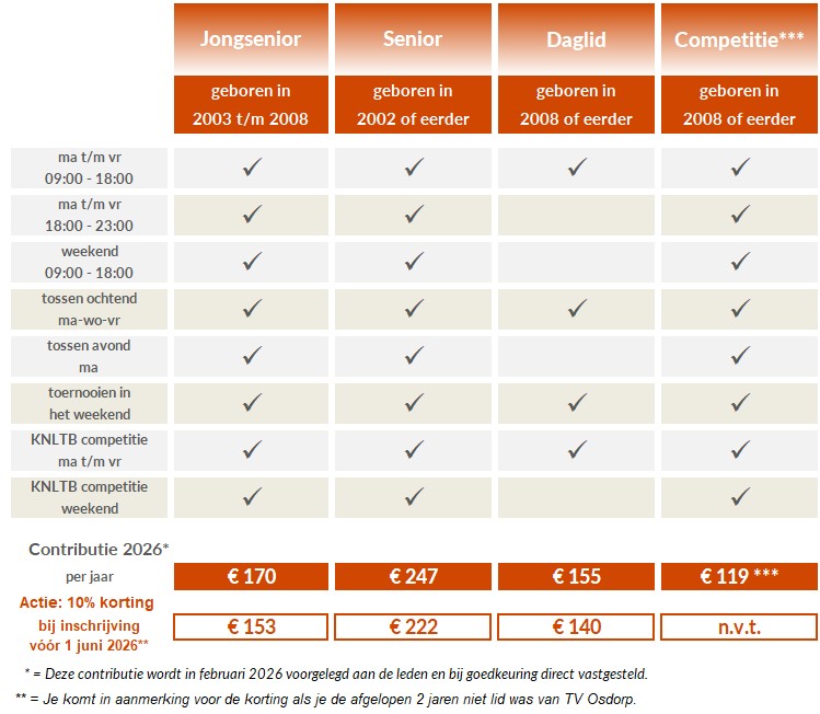 Het competitielidmaatschap is bedoeld om een team - indien nodig of gewenst - aan te vullen met een speler die geen (jong)senior-, dag- of juniorlidmaatschap van TV Osdorp heeft. Het geldt alleen voor de voorjaarscompetitie, dus voor de periode april tot en met begin juni (laatste inhaaldag van de competitie). In die periode mag je gebruikmaken van de tennisbanen voor trainingen met het competitieteam en deelnemen aan toernooien en activiteiten van TV Osdorp. Na afloop van de voorjaarscompetitie word je uitgeschreven als TV Osdorp-lid van de KNLTB, tenzij je besluit om lid te worden van TV Osdorp.